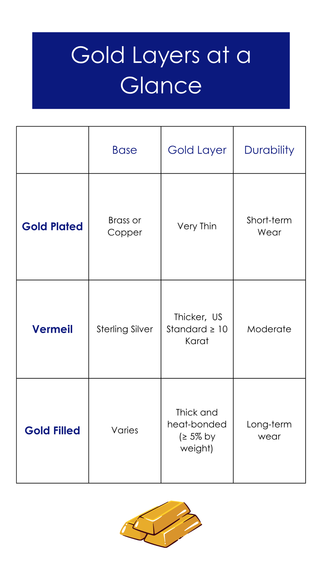 - Vermeil - A sterling silver base with a thick gold layer. In the U.S., the gold must be at least 10k and about 2.5 microns thick. This gives more durability than standard plating.