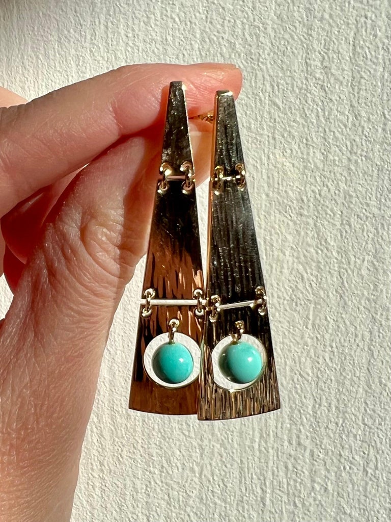 A pair of mid-century 14 karat yellow gold turquoise drop earrings with a bold geometric motif by modernist Danish designer Hans Hansen