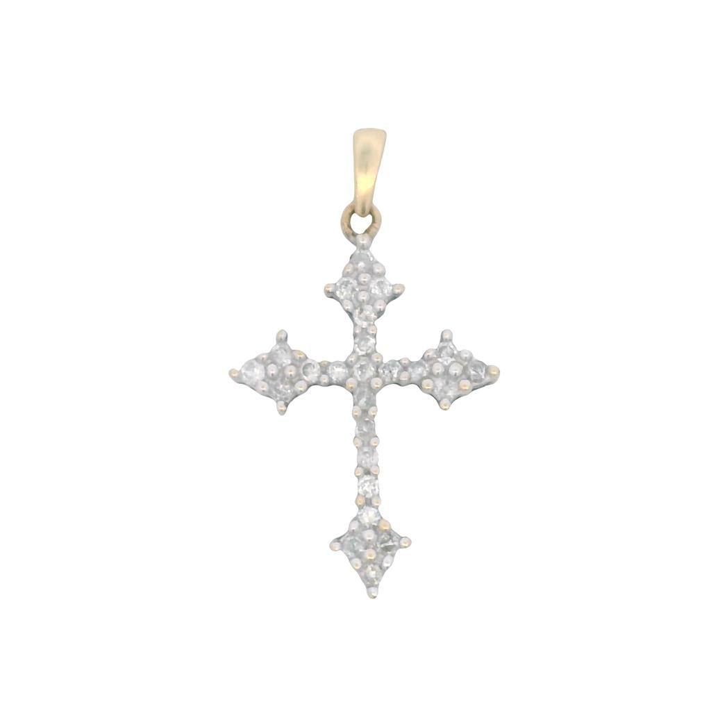 This elegant estate 10K yellow and white gold cross pendant weighing 1.36 grams features twenty-four round brilliant diamonds totaling approximately 0.24 carats with I-J color and I1-I3 clarity that create beautiful sparkle throughout the inspired design. The contemporary two-tone construction showcases stunning contrast between warm yellow gold and bright white gold, with diamond-studded arms extending to dramatic pointed ends that measure 1/2" x 1/4". Each of the four directional points features a cluster of diamonds in white gold settings, while the center vertical and horizontal arms are adorned with shimmering stones that catch light from every angle. The substantial yellow gold bail ensures secure wear while maintaining the piece's elegant proportions and sophisticated religious symbolism.