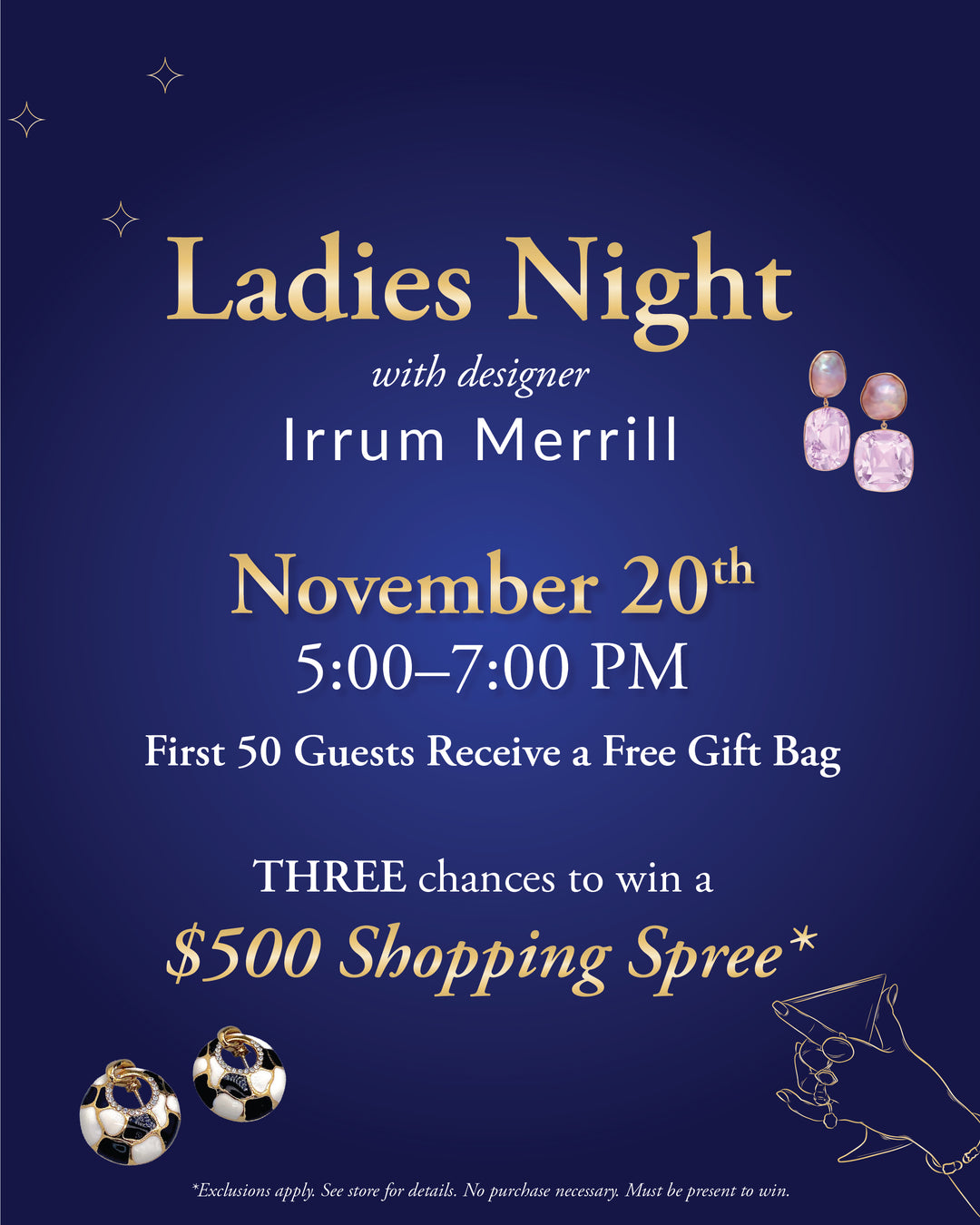 Grab your girlfriends and enjoy a cocktail and light bites while shopping for the season! We’ll show you the newest jewelry collections and trends while you fill out your wish list with the jewelry you've been dreaming of this year!