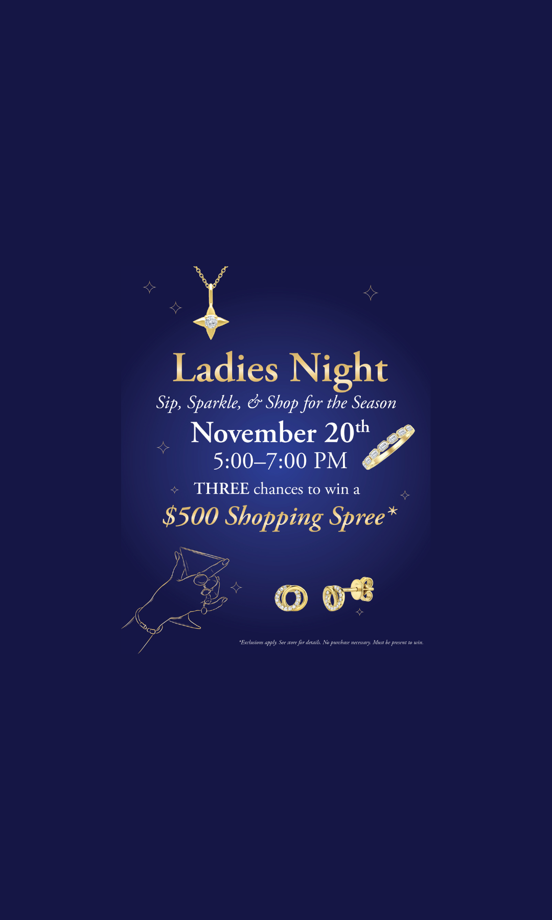 Grab your girlfriends and enjoy a cocktail and light bites while shopping for the season! We’ll show you the newest jewelry collections and trends while you fill out your wish list with the jewelry you've been dreaming of this year!