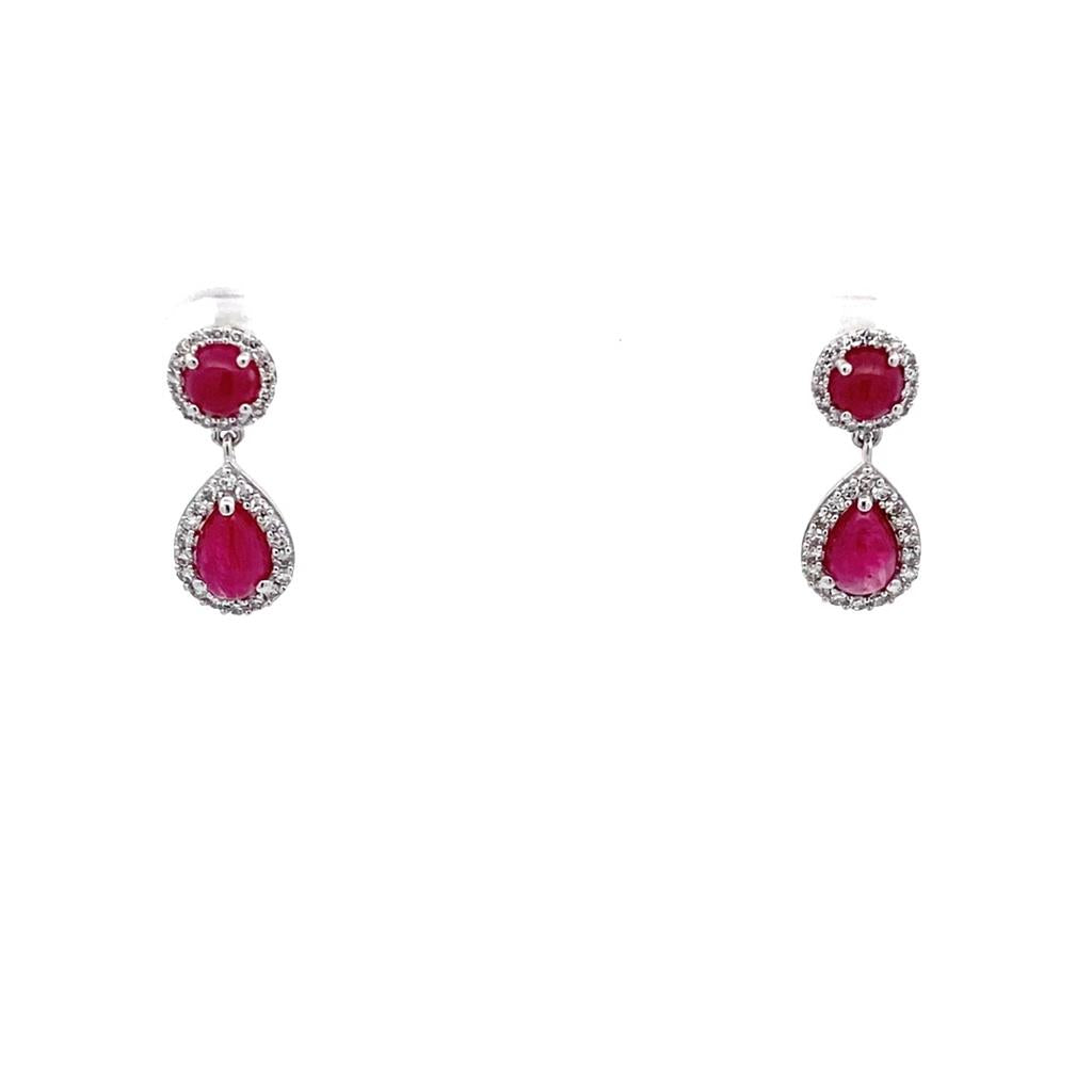 14K White Gold Cabochon Ruby & Diamond Halo Drop Earrings