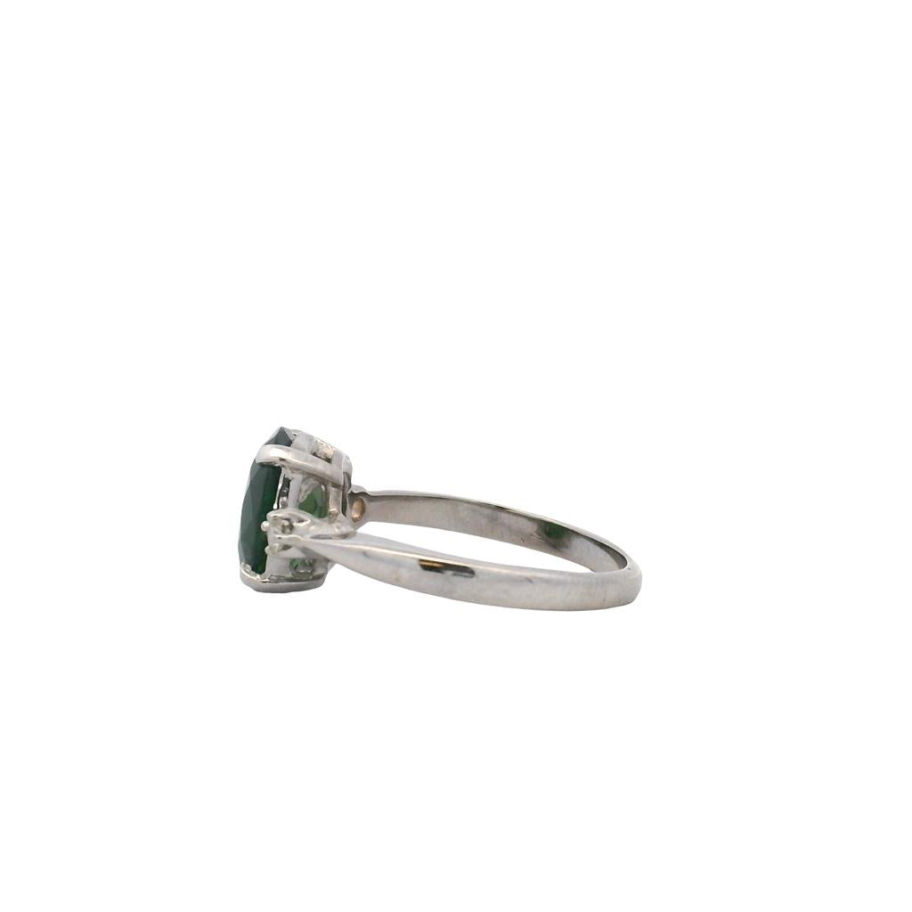 This elegant estate 14K white gold ring weighing 3.28 grams showcases a classic three stone design featuring one oval green tourmaline measuring 8x10mm and weighing approximately 2.24 carats in rich forest green hues. The substantial center tourmaline displays beautiful depth of color characteristic of fine green tourmaline gemstones, set in a secure four-prong mounting that allows maximum light to illuminate the stone's natural brilliance. Two round brilliant diamonds totaling approximately 0.06 carats with I-J color and SI2 clarity flank the center stone, adding sparkling accent detail to the shoulders in cool white gold. Sized at 7, this estate ring features timeless three stone styling with durable 14K white gold construction. This piece is offered as-is with noted condition issues: one diamond is chipped near the prong, the other diamond has a chipped culet tip, and the center tourmaline shows surface abrasion, all reflected in the pricing of this estate piece.
